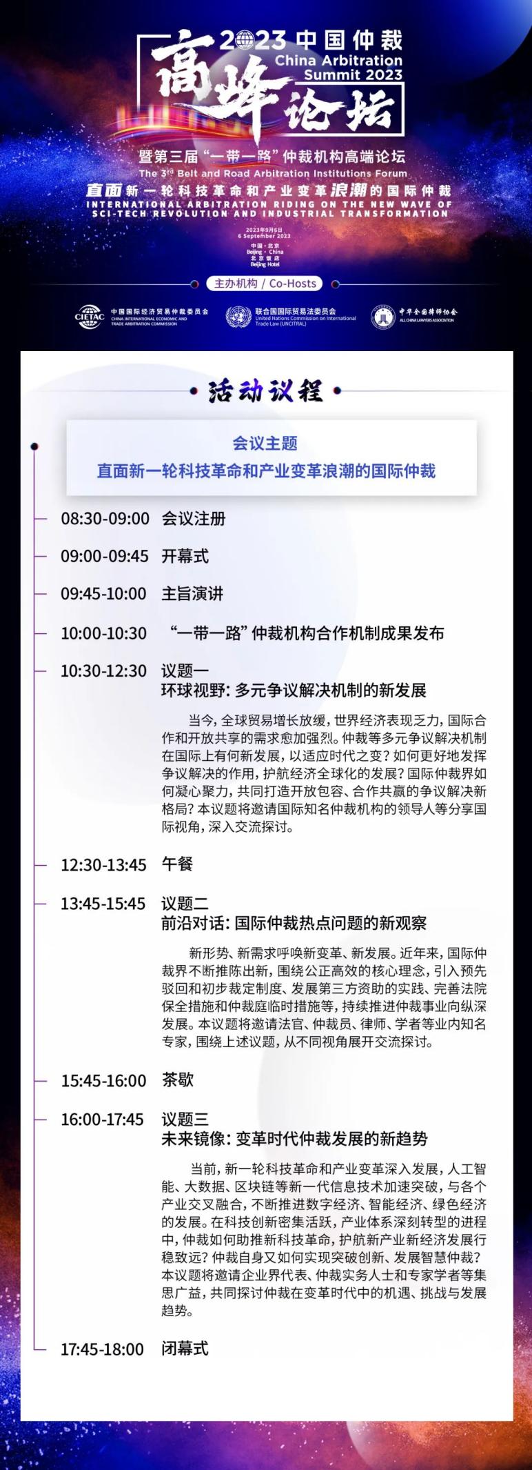 2023中國仲裁高峰論壇暨第三屆“一帶一路”仲裁機構(gòu)高端論壇將于2023年9月6日在北京召開。作為中國仲裁周期間最高規(guī)格的盛會,本屆論壇由中國國際經(jīng)濟貿(mào)易仲裁委員會、聯(lián)合國國際貿(mào)易法委員會以及中華全國律師協(xié)會等機構(gòu)聯(lián)合主辦,并獲得多家仲裁機構(gòu)和國際組織的鼎力支持。