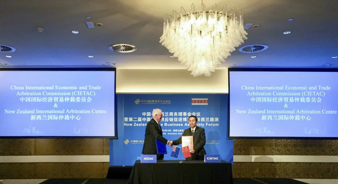 貿(mào)仲代表團(tuán)出席了由中國(guó)貿(mào)促會(huì)和新西蘭中國(guó)貿(mào)易協(xié)會(huì)共同主辦的中國(guó)-新西蘭商務(wù)理事會(huì)會(huì)議暨第二屆中國(guó)國(guó)際供應(yīng)鏈促進(jìn)博覽會(huì)新西蘭路演。任鴻斌會(huì)長(zhǎng)出席活動(dòng)并致辭,新西蘭-中國(guó)貿(mào)易協(xié)會(huì)主席約翰·考克倫(John Cochrane)、新西蘭貿(mào)發(fā)局大中華區(qū)主任白安祖(Andrew White)、中國(guó)駐新西蘭大使王小龍、駐奧克蘭總領(lǐng)事陳世杰等出席活動(dòng),中新兩國(guó)工商界代表200余與會(huì)。會(huì)上,貿(mào)仲副主任兼秘書(shū)長(zhǎng)王承杰與新西蘭國(guó)際仲裁中心主任約翰·格林(John Green)代表雙方簽訂了合作協(xié)議。該合作協(xié)議搭建了中新兩國(guó)仲裁機(jī)構(gòu)的交流平臺(tái),有利于通過(guò)共同努力增進(jìn)中方和新方企業(yè)在仲裁、爭(zhēng)議風(fēng)險(xiǎn)防范等方面的認(rèn)識(shí)與理解。