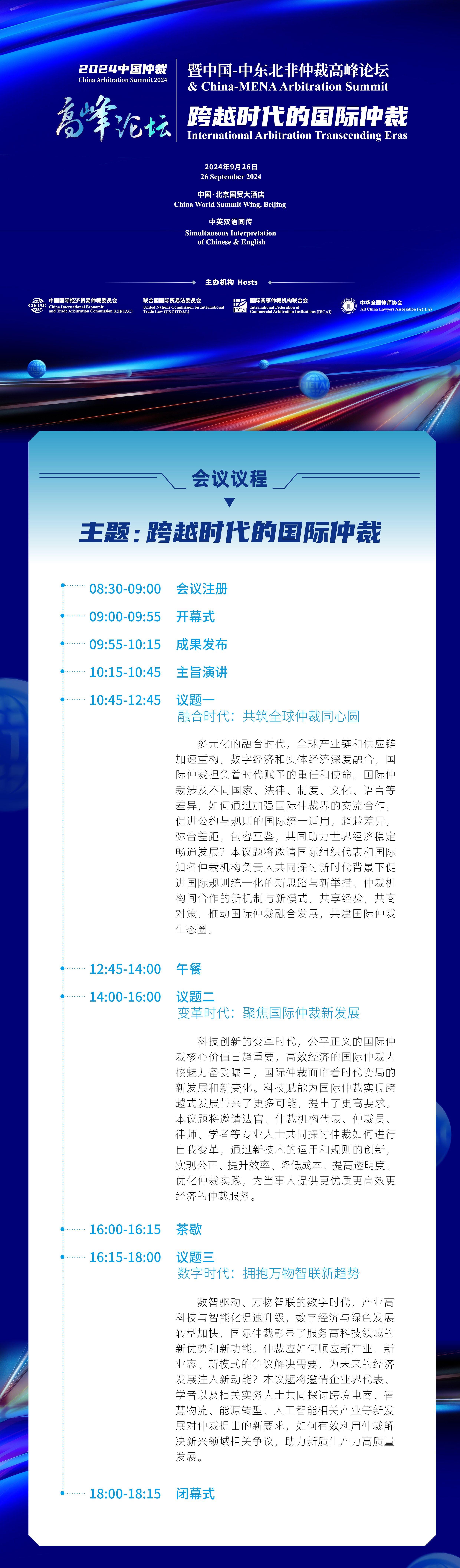 由中國國際經(jīng)濟(jì)貿(mào)易仲裁委員會(CIETAC)、聯(lián)合國國際貿(mào)易法委員會(UNCITRAL)、國際商事仲裁機(jī)構(gòu)聯(lián)合會(IFCAI)以及中華全國律師協(xié)會(ACLA)聯(lián)合舉辦的2024中國仲裁高峰論壇暨中國-中東北非仲裁高峰論壇將于2024年9月26日在北京舉辦。