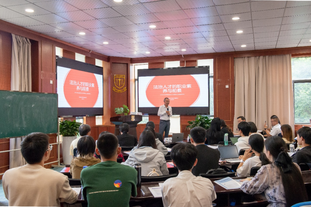 原美的集團(tuán)全球法務(wù)總監(jiān)、貿(mào)仲仲裁員陳敏作專題演講。陳敏談到,法治人才的職業(yè)素養(yǎng)并不是一種知識,而是一種訓(xùn)練,法學(xué)院的學(xué)生應(yīng)當(dāng)具備的職業(yè)素養(yǎng)包括樹立證據(jù)意識、做事留痕、具備批判思維和審慎品質(zhì)等。法治人才的難得在于不但需要有扎實(shí)的法律知識,還需要具備更多其他行業(yè)的基礎(chǔ)知識,必須有意識地突破自己的職業(yè)局限,多方面培養(yǎng)自己的知識體系。他還以網(wǎng)絡(luò)熱詞為例,談?wù)摿四壳暗纳鐣蜆I(yè)情況及學(xué)子們進(jìn)入職場后可能會遇到的問題,并給出了解決方式和建議。最后,他以“主動權(quán),決定生存權(quán)”作為結(jié)束語,呼吁學(xué)子們厚積薄發(fā),主動把握未來。