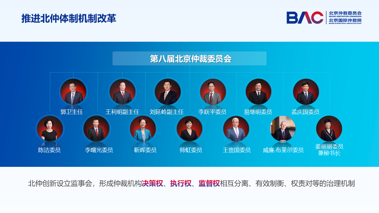 據(jù)介紹,北仲本輪體制機制改革是以第八屆仲裁委員會換屆為標志的。2023年9月,由13位在法律、金融、數(shù)字經(jīng)濟、知識產(chǎn)權、國際商事爭議解決等領域的資深專家組成的第八屆北仲委員會成立,其中包括兩名境外專業(yè)人士。同時,北仲創(chuàng)新設立了監(jiān)事會作為實體運行的監(jiān)督機構,與秘書局共同形成了仲裁機構決策權、執(zhí)行權、監(jiān)督權相互分離、有效制衡、權責對等的法人治理機制。