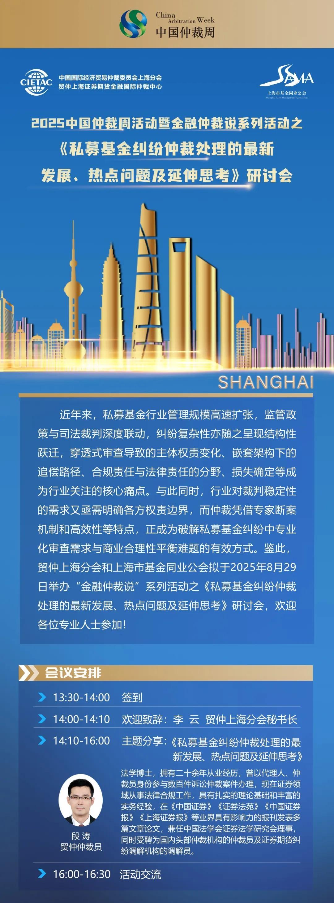 由中國(guó)國(guó)際經(jīng)濟(jì)貿(mào)易仲裁委員會(huì)等單位聯(lián)合發(fā)起的2025年第十三屆中國(guó)仲裁周即將拉開(kāi)帷幕。為進(jìn)一步提升中國(guó)仲裁周活動(dòng)平臺(tái)專業(yè)價(jià)值與全球影響力,貿(mào)仲上海分會(huì)和上海市基金同業(yè)公會(huì)將于2025年8月29日舉辦2025中國(guó)仲裁周活動(dòng)暨金融仲裁說(shuō)系列活動(dòng)之《私募基金糾紛仲裁處理的最新發(fā)展、熱點(diǎn)問(wèn)題及延伸思考》研討會(huì),期待各位嘉賓報(bào)名參與。