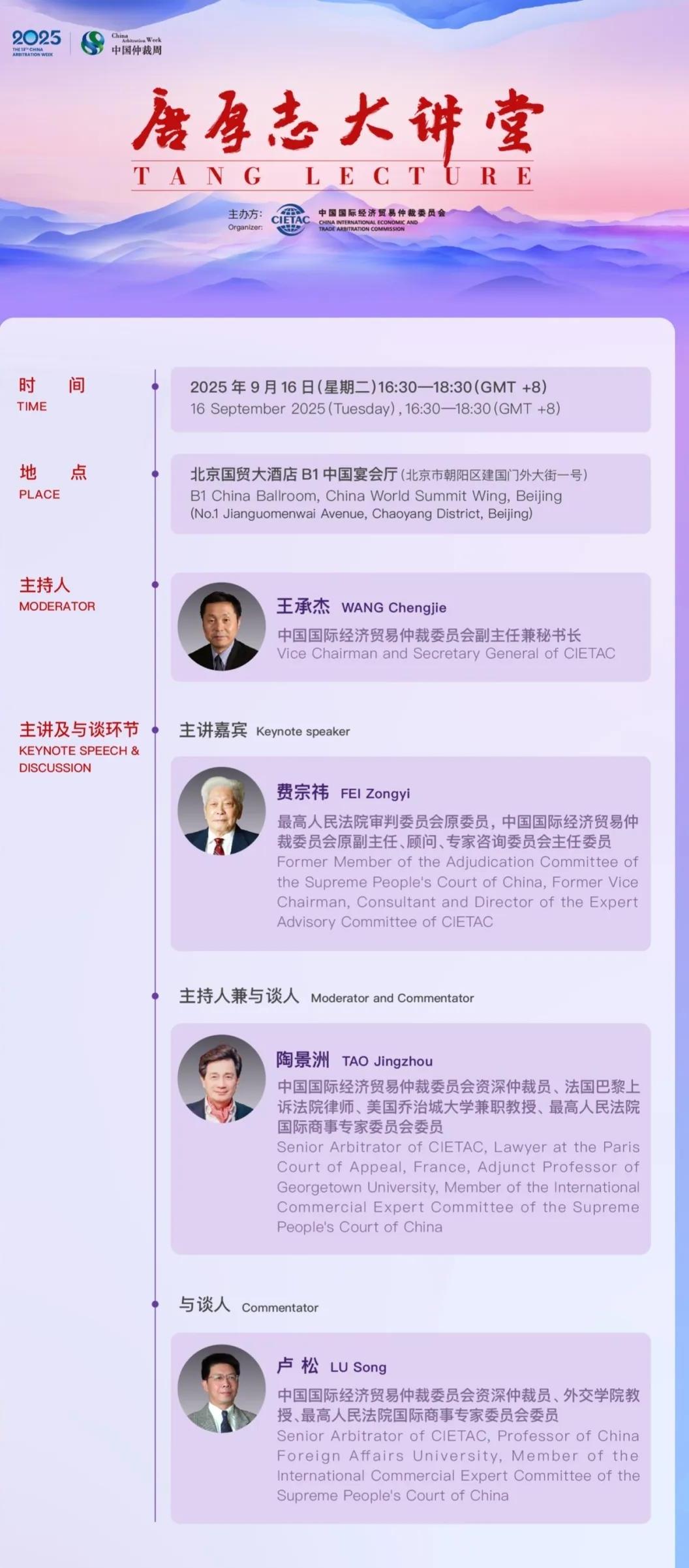 The 9th TANG Lecture organized by China International Economic and Trade Arbitration Commission (CIETAC) will be held at 16:30 on 16th September 2025 at the B1 China Ballroom, China World Summit Wing, Beijing (No.1 Jianguomenwai Avenue, Chaoyang District, Beijing).