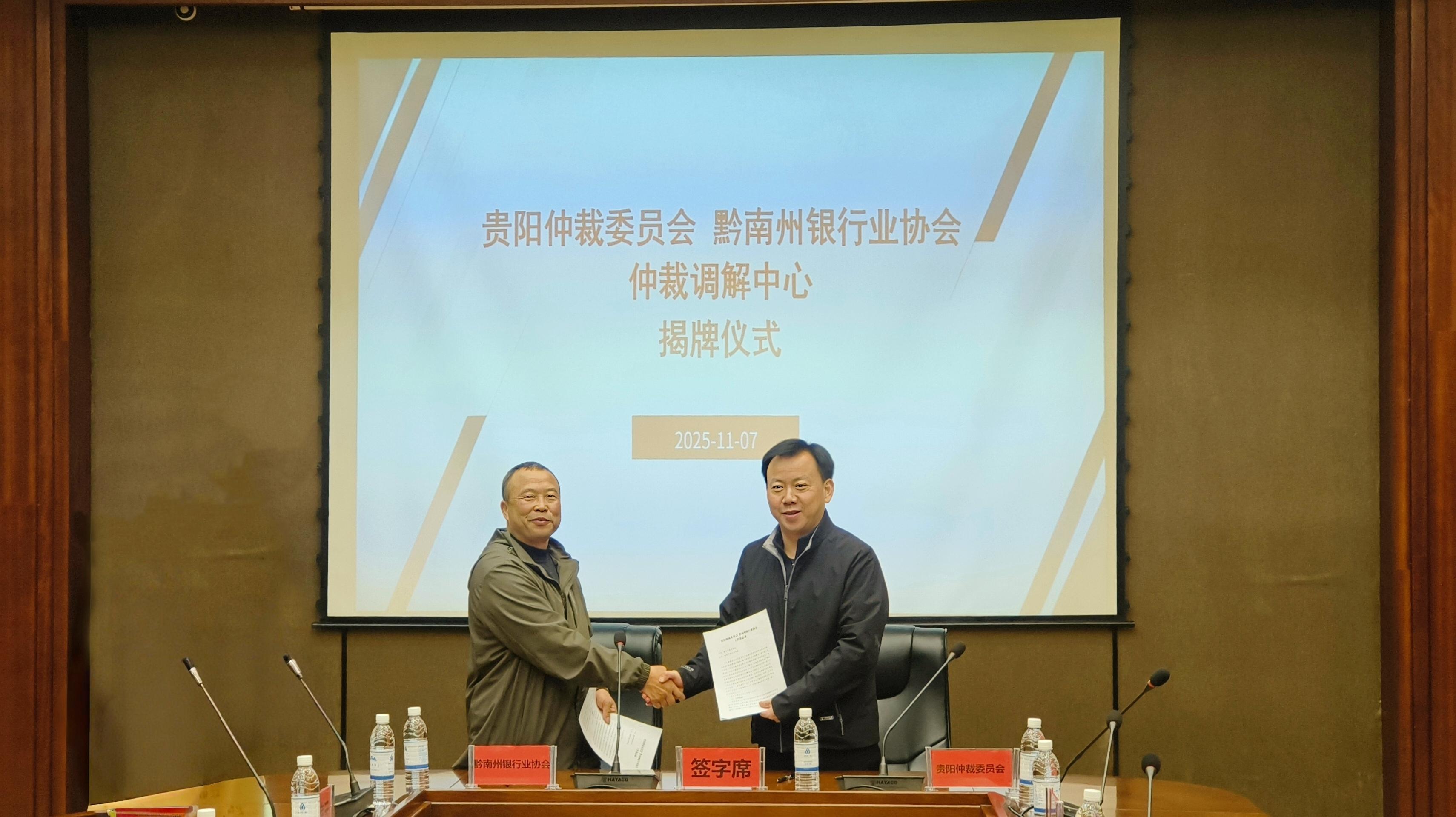 為健全黔南州金融糾紛多元化解機(jī)制,提升金融領(lǐng)域矛盾糾紛化解質(zhì)效,11月7日,“貴陽(yáng)仲裁委員會(huì)黔南州銀行業(yè)協(xié)會(huì)仲裁調(diào)解中心”揭牌儀式順利舉行。貴陽(yáng)仲裁委員會(huì)主任卜貴榮、黔南州金融監(jiān)管分局副局長(zhǎng)劉廷志共同為仲裁調(diào)解中心揭牌,貴陽(yáng)仲裁委員會(huì)副主任王常毅與黔南州銀行業(yè)協(xié)會(huì)秘書(shū)長(zhǎng)陳傳勛簽署工作備忘錄。