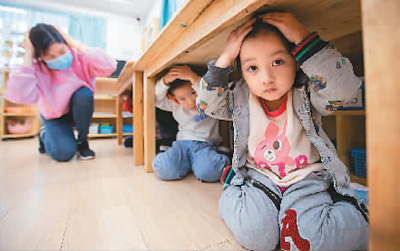 圖四:江蘇省南京市雨花臺(tái)區(qū)龍福幼兒園小朋友們學(xué)習(xí)防災(zāi)減災(zāi)自救技能。