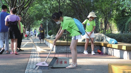 小小“職業(yè)體驗官”清掃路面。