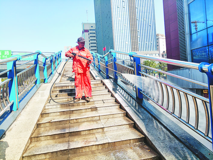 蜀山區(qū)環(huán)衛(wèi)工人清洗人行天橋。 記者 代敏 劉全超 攝
