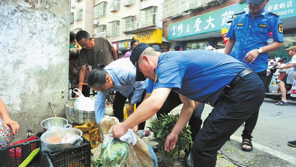 “我們采取延時、錯時,定人、定崗、定責的工作機制,安排執(zhí)法隊員錯時對農(nóng)貿(mào)市場周邊及臨街門店開展逐一檢查,堅決杜絕部分商戶、流動攤販出店經(jīng)營、占道經(jīng)營和擺放遮陽傘阻擋過道等行為?!痹诮瘗樎繁眰?cè)花板橋菜市場及花鳥路周邊,區(qū)城管局五里牌中隊通過采用錯時執(zhí)法和取締一批、歸市一批、疏導一批的辦法,在花鳥路附近的南北樓設(shè)立臨時疏導區(qū),為自產(chǎn)自銷的菜農(nóng)創(chuàng)造合法的經(jīng)營地點,通過耐心宣傳相關(guān)政策規(guī)定,主動幫助商戶搬移占道物品等文明執(zhí)法方式,工作得到廣大商戶和流動攤販的理解及市場周邊百姓的支持。