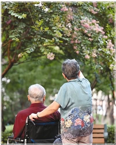 天津,一名老人推著殘疾人丈夫賞花。新華社記者 李 然攝