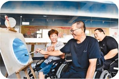 山東省威海市長(zhǎng)城愛(ài)心大本營(yíng)2015年起實(shí)施“輪椅上的畫(huà)家夢(mèng)”助殘扶貧公益項(xiàng)目,聘請(qǐng)老師教授油畫(huà),并舉辦殘疾人油畫(huà)展覽和拍賣會(huì)等活動(dòng),幫助殘疾人創(chuàng)收增收。新華社記者 郭緒雷攝