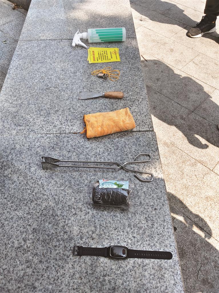 “非機(jī)動(dòng)車停車區(qū)的車輛亂停,請(qǐng)來整理?!薄皬V場(chǎng)上有一塊油污,趕緊把洗掃機(jī)開過來清理。”“公交站臺(tái)上的座椅上有灰塵,來擦拭下?!薄浾攥F(xiàn)場(chǎng)看到,新吳“城市管家”除了統(tǒng)一著裝和隨身攜帶一部對(duì)講機(jī)外,還統(tǒng)一配備了智能手環(huán)、噴水壺、鏟子、夾子、干濕抹布、口哨、文明停車告知單等作業(yè)“八件套”(如圖)。江溪街道“城市管家”郭師傅邊展示他的裝備邊介紹:“這些都是我們?nèi)粘9ぷ髦械挠H密‘伙伴’,能讓我的工作更高效。比如智能手環(huán),不僅能記錄我日常的工作軌跡,還能監(jiān)測(cè)心率、血壓、血氧等身體數(shù)據(jù)。如果在工作中出現(xiàn)身體不適,手環(huán)會(huì)及時(shí)提醒我休息。鏟子、噴水壺、抹布等工具小巧便捷,分類放到定制的腰包里,隨身攜帶,拿取方便?!?/p>