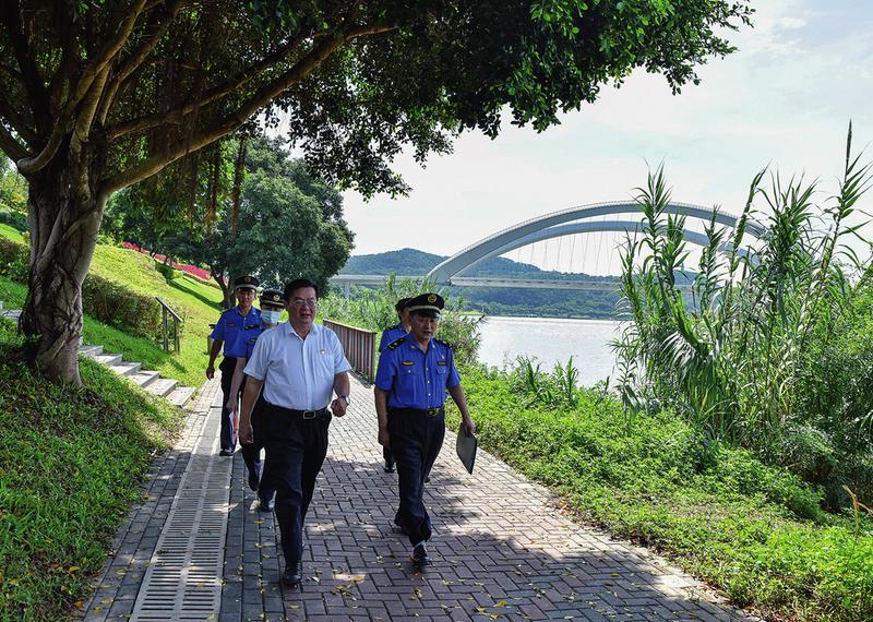 南寧市城管綜合執(zhí)法局局長梁勇(前左一)、南寧市城管支隊(duì)支隊(duì)長牛繼成(前右一)帶隊(duì)巡查邕江沿岸公園(本版圖片均由南寧市城管支隊(duì)提供)