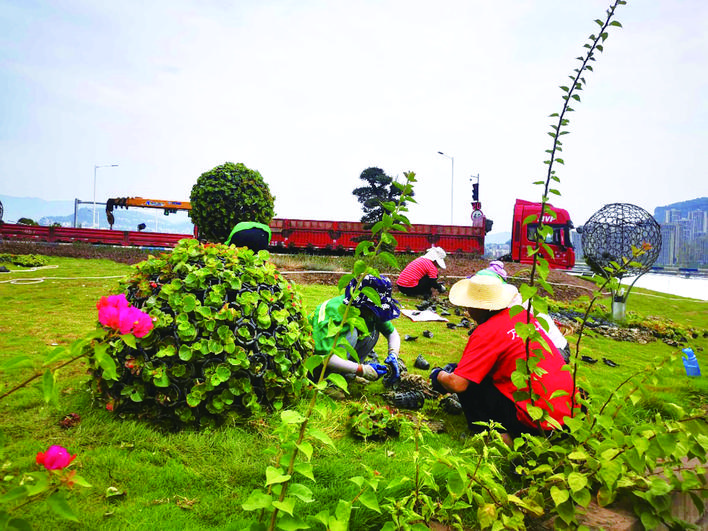 日前,記者在王牌路口節(jié)點(diǎn)看到,園林工人們正在這里換種鮮花,將草坪中間造型上布滿四季海棠,讓鮮花形成鮮艷的花球。在天仙湖攔砂壩,鞍式花箱中替換成了太陽花,花朵盛開嬌艷美麗,與仍在綻放的三角梅相映成趣,在城市高樓長(zhǎng)街、萬安大橋、一江碧水的大背景下自成風(fēng)景線。
