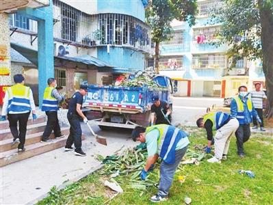 社區(qū)服務(wù)隊和居民一起清理垃圾。 記者 趙梓 攝