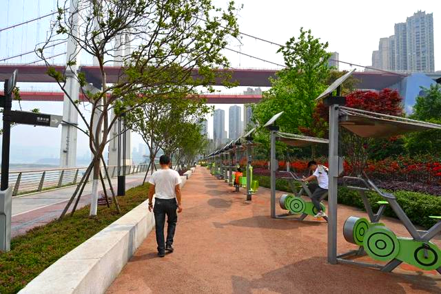 過去,橋下空地有時用于停放車輛、栽種綠植;更多時候,它們被“荒”著,規(guī)劃學(xué)界稱之為城市“剩余空間”或“灰空間”。而今在重慶市九龍坡區(qū),橫跨長江的鵝公巖大橋下坐落著生機盎然的九龍灘廣場。市民可在1000平方米的智能健身區(qū)體驗太陽能充電的健身設(shè)施,也可在三道貫通的江邊步道親近自然、游玩休憩。