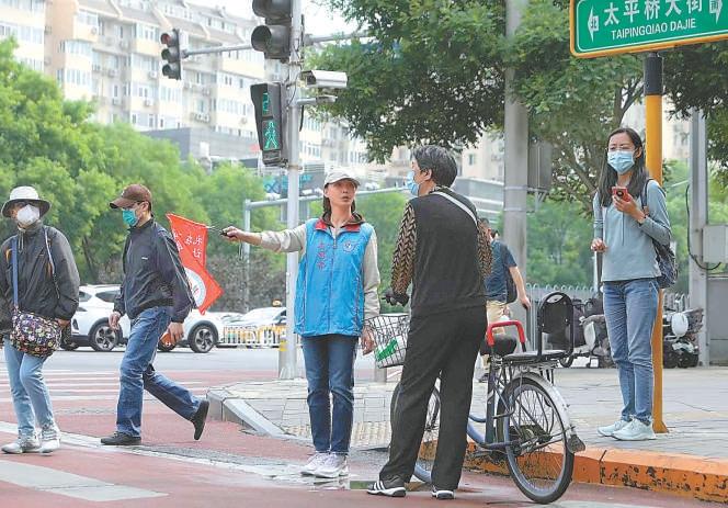 昨天,全市各級文明單位的干部職工在早晚高峰走出單位,參與勸阻非機動車闖燈、逆行,行人不走安全橫道線等交通違法行為。 記者 方非攝
