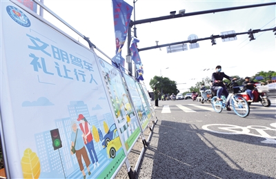 2021年10月8日,東城區(qū)寬街十字路口,擺放著文明駕車禮讓行人的海報(bào)。記者 李木易 攝