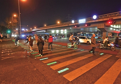 2021年12月20日,東城區(qū)雍和宮橋下,智能斑馬線地面發(fā)光樁與交通信號(hào)燈相互匹配,確保行人過街安全。記者 王貴彬 攝