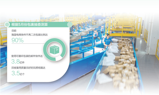根據(jù)5月份包裹抽查測算,目前,我國電商快件不再二次包裝比例達90%,使用可循環(huán)包裝的郵件快件達3.8億件,回收復(fù)用質(zhì)量完好的瓦楞紙箱達3.5億個。