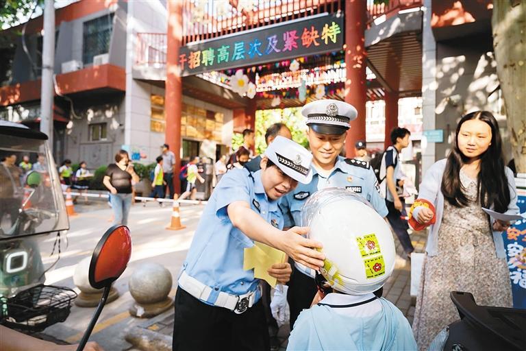 交警在校門口為遵守“一盔一帶”要求的小朋友貼上“小紅花”反光車貼。通訊員 孫崇明 攝