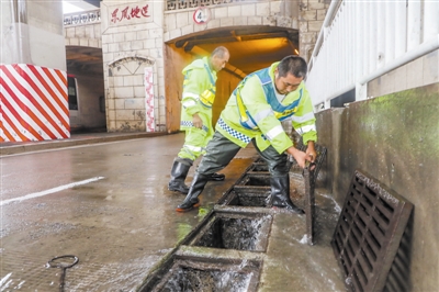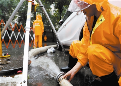為應(yīng)對強降雨,天津市各級排水所組織近1200名排水職工連續(xù)多日晝夜堅守崗位,及時排查、處理暴雨可能導(dǎo)致管道堵塞、涌水峰超負荷等險情。上圖 工作人員在東風地道打井放水。記者 周偉 攝