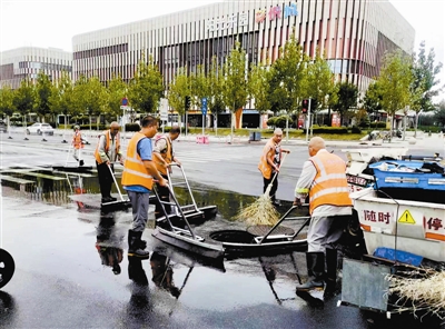 為應(yīng)對此次強降雨,天津市環(huán)衛(wèi)部門16000名環(huán)衛(wèi)工人奮戰(zhàn)在第一線,753部作業(yè)車輛全部在崗,及時對城市環(huán)境進行清整作業(yè),保障市民安全出行。圖為河西區(qū)環(huán)衛(wèi)工在樂園道等區(qū)域排水。 記者 龐劍 攝