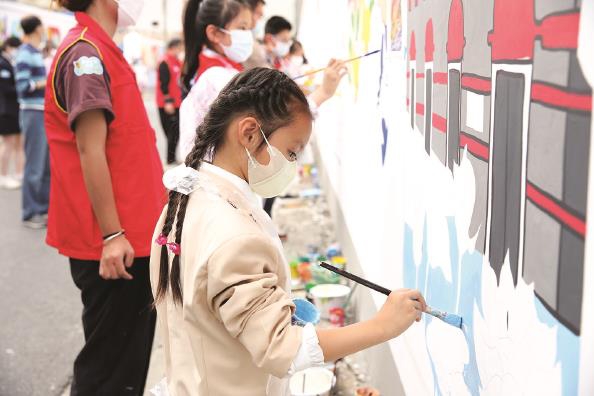孩子們將自己的作品手繪于少年路墻面