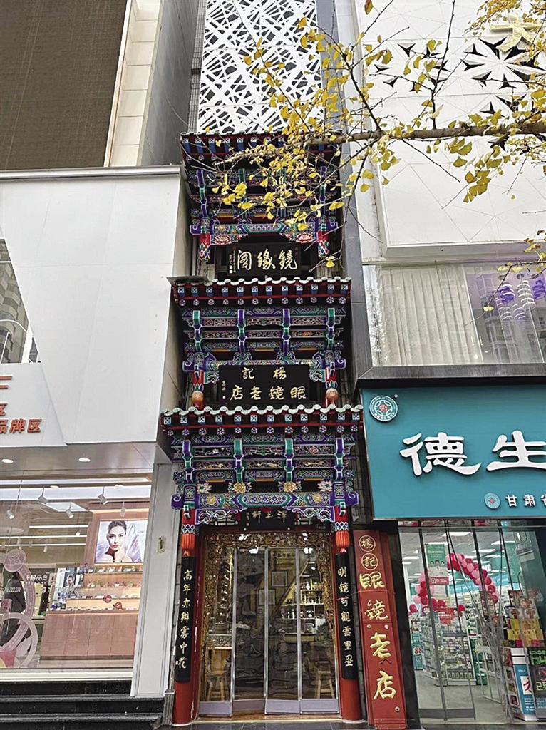 榫卯鑲嵌、手工木雕、精致彩繪、金箔貼邊,在張掖路步行街上,楊記眼鏡行的門樓招牌格外亮眼,雖然只有三四米寬的窄小門面,但店外從上而下的三塊古韻招牌彰顯出這家店的“不簡單”?!白钕旅孢@塊‘澤玉軒’的招牌是我家祖輩楊澤玉開創(chuàng)這家眼鏡行時留下的字號”,楊記眼鏡行是蘭州一家老字號的石頭眼鏡售賣和維修小店,光是制作修理石頭眼鏡這項手藝就已經(jīng)傳到了第五代,其店鋪在二十世紀八九十年代就獲得過商務(wù)部的“中華老字號”認可。