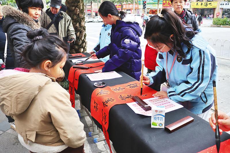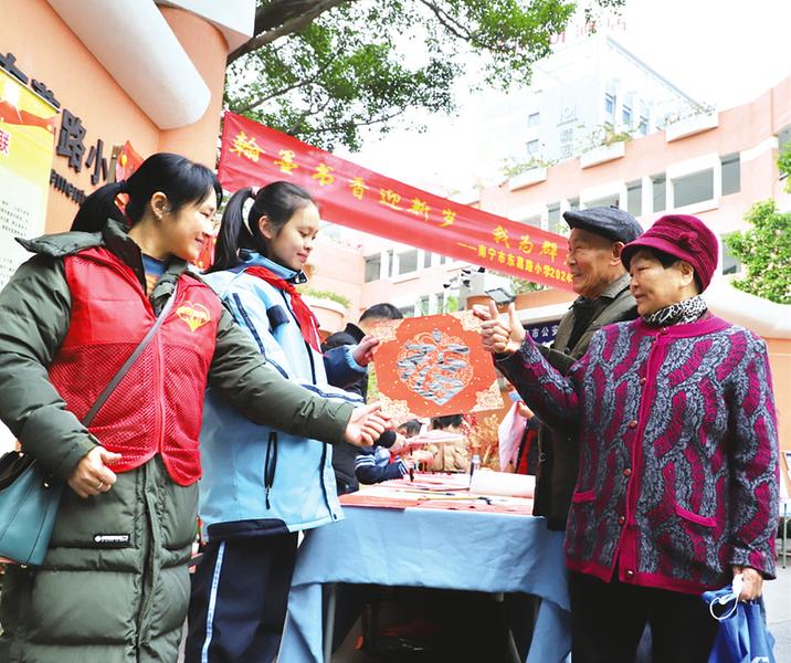 南寧市五象新區(qū)第三實驗小學(xué)黨員教師帶領(lǐng)學(xué)生們深入周邊社區(qū),開展“迎新春、寫春聯(lián)、送春聯(lián)”活動,為群眾送上新春的祝福。(江虹霞 攝)