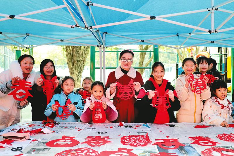 南寧市榮和實驗學(xué)校攜手社區(qū)、物業(yè)開展“欣欣向榮迎新年 文明實踐樹新風(fēng)”志愿服務(wù)活動,黨員教師、少先隊員代表現(xiàn)場揮毫潑墨書寫春聯(lián)和“?!弊?、剪窗花,表達對新年的美好祝愿和對美好生活的向往。(嚴文娟 攝)