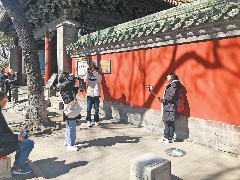 今年春節(jié)期間,國子監(jiān)街恢復了游客摩肩接踵的熱鬧,日均游客量達到了三四萬人次。春節(jié)過后,隨著氣溫回升,周末的單日客流量也能達到1.5萬人次??讖R的紅墻下、國子監(jiān)街的牌樓前,隨處可見中外游客拍照打卡的身影。