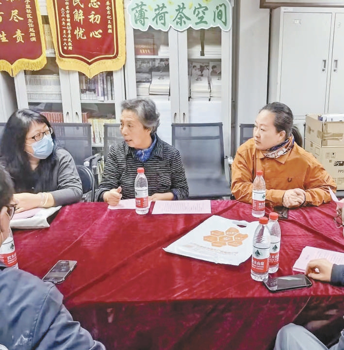 國子監(jiān)社區(qū)居民代表李秀芬(居右)正在居民議事會上發(fā)表建議。