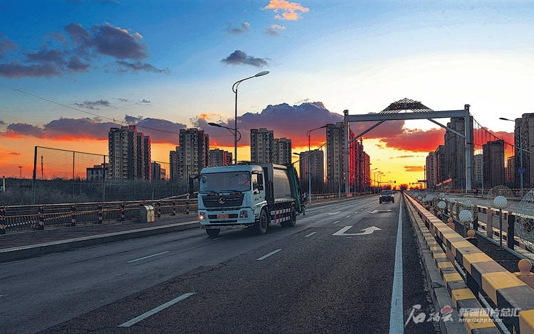 4月5日,落日余暉下,王秋云駕駛著清運車行駛在烏魯木齊經(jīng)濟(jì)技術(shù)開發(fā)區(qū)(頭屯河區(qū))金風(fēng)大橋上。