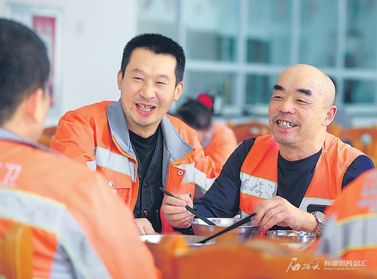 4月5日13時許,王秋云(右)和工友在食堂用餐。