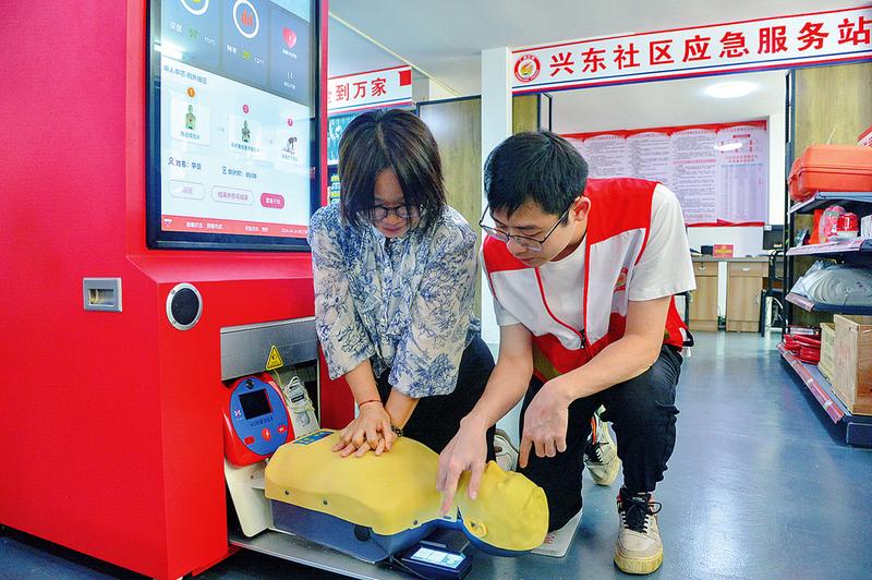 在興東社區(qū)應(yīng)急服務(wù)站,廣西安全生產(chǎn)科學研究院的工作人員利用心肺復(fù)蘇急救培訓一體機開展示范教學,并邀請居民實操訓練。記者 黃維業(yè) 攝
