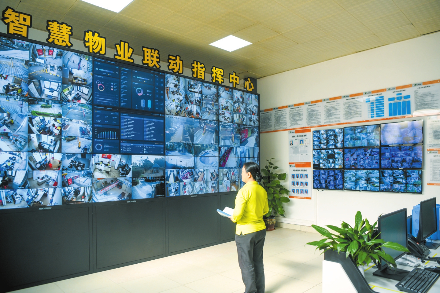在??谒募救A庭小區(qū),工作人員在智慧物業(yè)聯(lián)動(dòng)指揮中心觀看小區(qū)內(nèi)情況。記者 楊鶴 攝