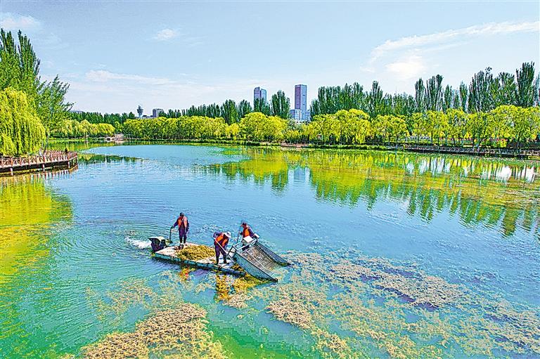 5月8日,銀川市河道管理所的工作人員清撈典農(nóng)河河道內(nèi)的水草。隨著氣溫升高,典農(nóng)河中的水草進入生長繁殖高發(fā)期,大面積生長的水草不僅會影響河道景觀,腐爛的水草還會對水域造成污染、滋生蚊蠅,影響水域生態(tài)環(huán)境。針對不同水域水草生長態(tài)勢,銀川市水務部門按照“科學管控、生態(tài)治理”的原則提前安排,分河段、分時間對過量生長的水草實施修剪、打撈清理,讓河水保持清澈,為市民創(chuàng)造良好的宜居環(huán)境。(記者馬楠 王洋 攝)