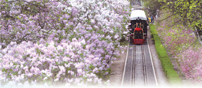 哈爾濱市兒童公園小火車在丁香花海中穿行。張樹 攝(影像中國)
