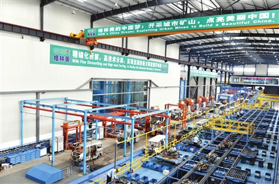 在這里,一輛報(bào)廢汽車(chē)被送上流水線,僅15分鐘就從整車(chē)變?yōu)樗槠F扑楹蟮臍堅(jiān)杆龠M(jìn)入分選流水線,自動(dòng)分類回收銅、鋁、塑料等材料,經(jīng)專業(yè)化處理可節(jié)能六成、節(jié)材七成,為下游企業(yè)提供低耗能、低排放、高效率的資源保障。