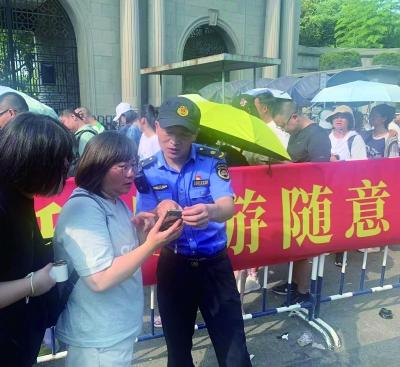上午10時(shí)后,“總統(tǒng)府”景區(qū)前等待進(jìn)場(chǎng)的游客逐漸減少,李洋也將巡查保障的陣地由景區(qū)外轉(zhuǎn)至景區(qū)內(nèi)。和來(lái)自公安、文化執(zhí)法等部門的同志一起對(duì)景區(qū)內(nèi)的“黃牛”、無(wú)資質(zhì)導(dǎo)游等進(jìn)行規(guī)勸執(zhí)法等,“我們既是這座城市的管理員,也是這座城市的宣傳員,更是景點(diǎn)的引導(dǎo)員,讓更多人愛(ài)上有序的南京,熱一點(diǎn)、辛苦一點(diǎn)算不上啥?!崩钛笳f(shuō)。