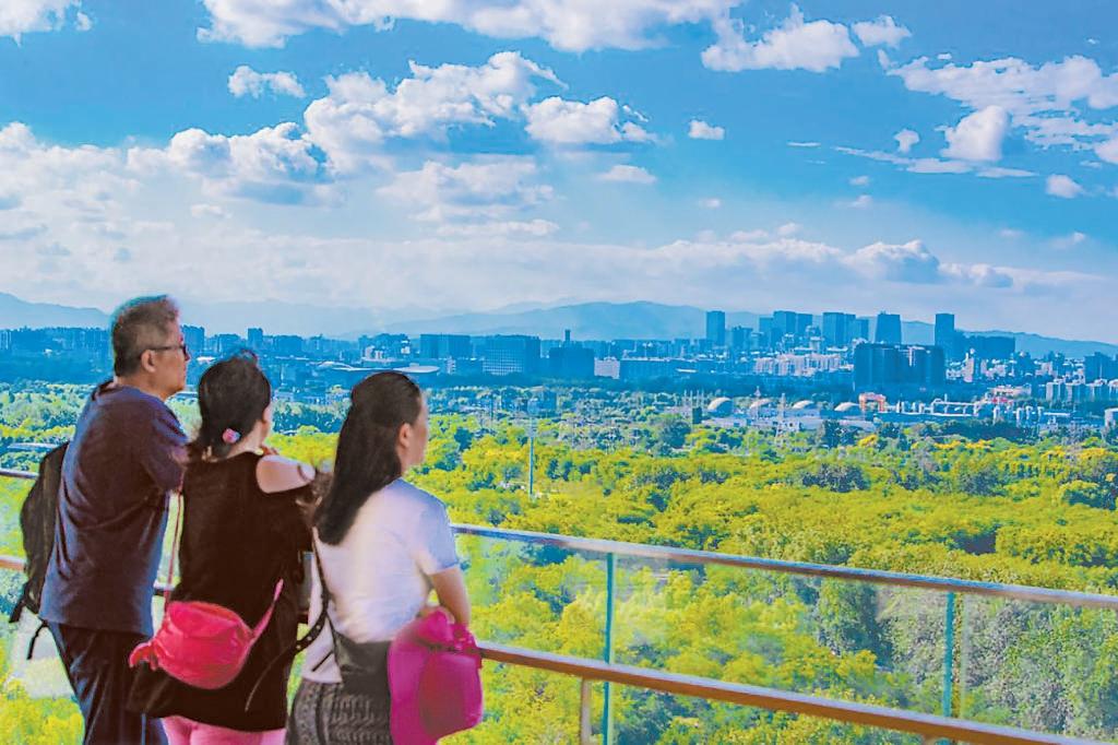 市民在南苑森林濕地公園觀景臺上欣賞京城美景。 原梓峰 攝