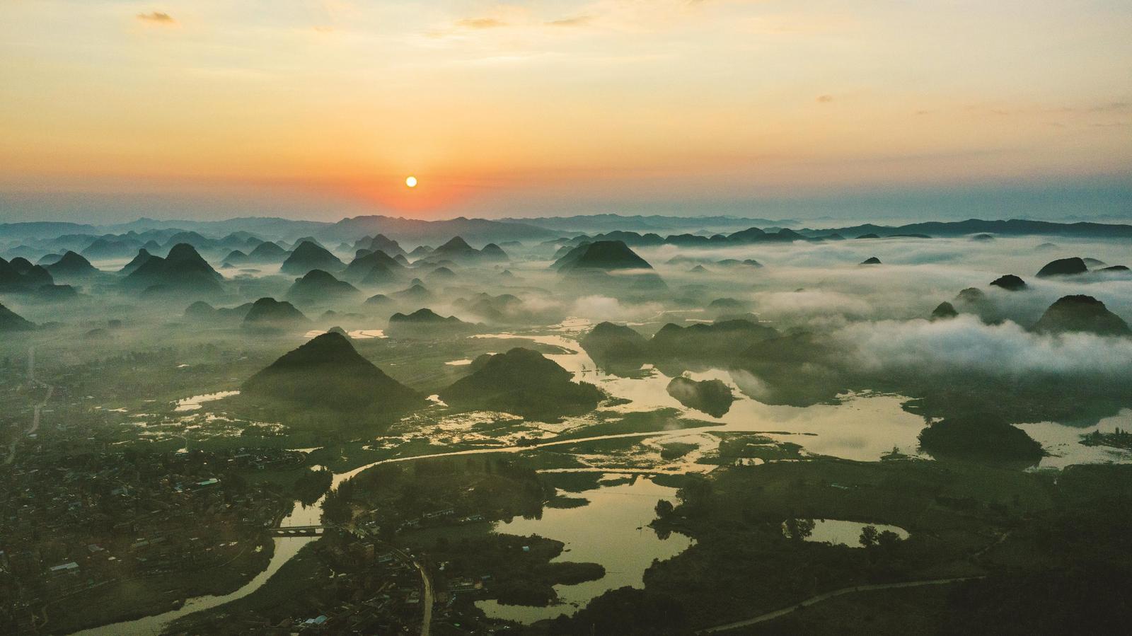 10月7日,云霧繚繞中的云南省文山壯族苗族自治州丘北縣普者黑喀斯特國(guó)家濕地公園(無(wú)人機(jī)照片)。
