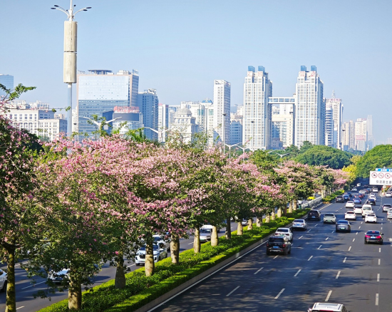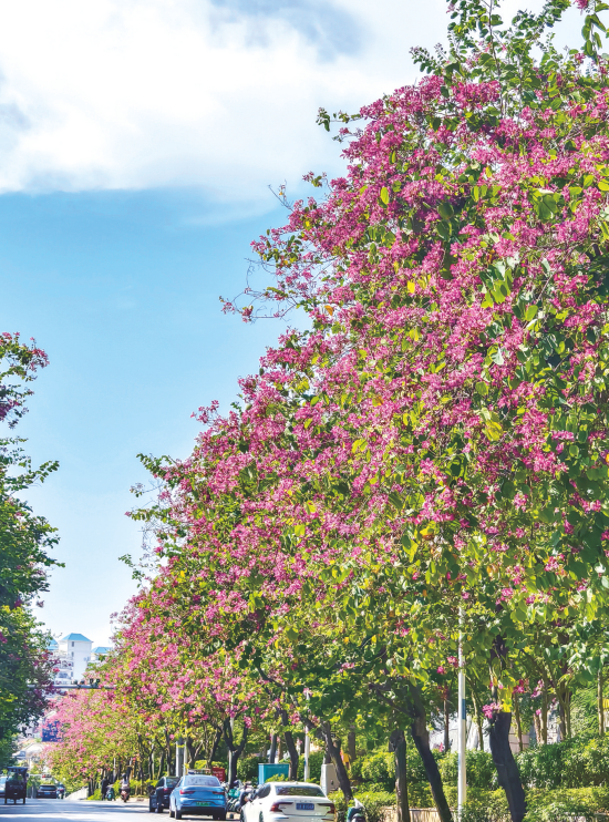秋風(fēng)拂過(guò),城市各條道路、橋梁兩旁,綠樹和各色花朵相互映襯,演繹著專屬綠城的秋日浪漫。綠城南寧,“綠”是不變的底色。民族大道兩旁,異木棉花開一路,在綠樹映襯下分外美麗。古城路綠樹成蔭,機(jī)動(dòng)車、行人穿行其間,陽(yáng)光從樹葉間灑下。百花嶺路兩旁的羊蹄甲花競(jìng)相開放,讓道路變成了花廊。邕城秋色中,又怎能少得了三角梅?良慶大橋上的三角梅熱情綻放,與從江上駛過(guò)的船只構(gòu)成了一幅寫意的畫卷……(記者 覃雨軒)