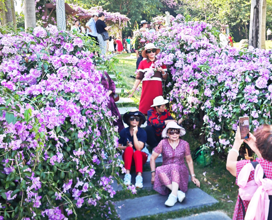 南湖公園里蒜香藤開出紫色“瀑布”,吸引眾多游客。記者 梁楓 攝