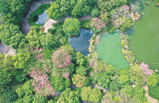 民族廣場(chǎng)上,孩子們?cè)谇锶张?yáng)下奔跑、與鴿子嬉戲;五象湖公園內(nèi),時(shí)??梢娛忻襁\(yùn)動(dòng)的身影,處處充滿無(wú)限的生機(jī)與活力;獅山公園里,落羽杉換上金黃色的“新衣”,仿佛秋天的使者,向人們傳遞季節(jié)的更迭;南湖公園里,蒜香藤形成紫色“瀑布”,讓人仿佛進(jìn)入一個(gè)紫色的夢(mèng)幻世界;青秀山風(fēng)景區(qū)層林盡染,人們?cè)谌~子花園里拍照打卡,在金杉湖邊漫步……
