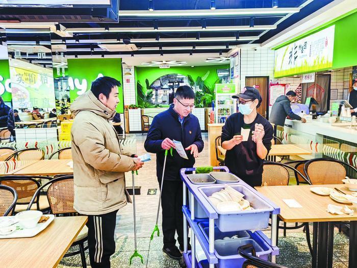 圖為網(wǎng)格員在餐飲門店中發(fā)放宣傳彩頁。