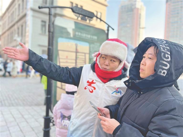 2月4日,農(nóng)歷正月初七。在位于哈爾濱市道里區(qū)中央大街與西十五道街交口處的志愿者服務(wù)站,亞冬會城市側(cè)志愿者張琦正忙著為有需求的游客服務(wù)。