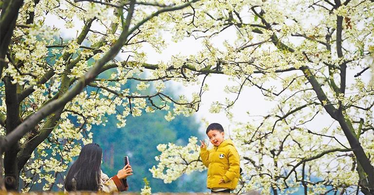 2月15日,廣西賀州市蓮塘鎮(zhèn)美儀村,市民游客在賞花拍照。黃旭胡 攝(中經(jīng)視覺(jué))