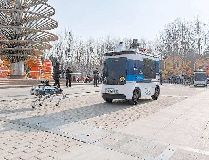 機(jī)器狗與無(wú)人駕駛巡邏車(chē)在經(jīng)開(kāi)區(qū)公園內(nèi)巡邏。