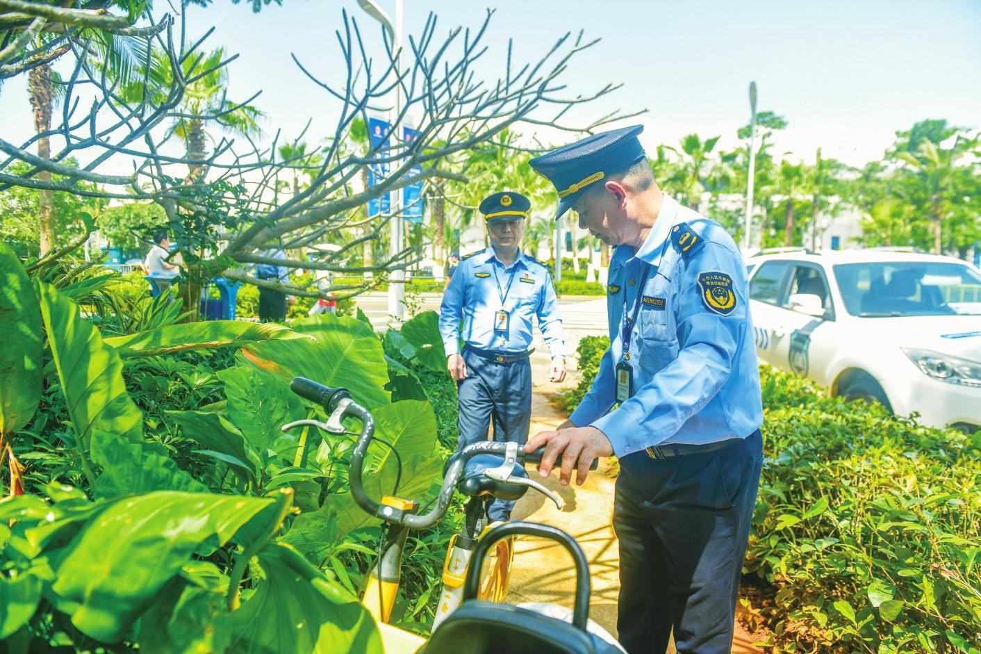 海口市綜合行政執(zhí)法局生態(tài)環(huán)境保護行政執(zhí)法支隊第二執(zhí)法大隊一級主任科員張京福等人規(guī)范電動自行車停放。